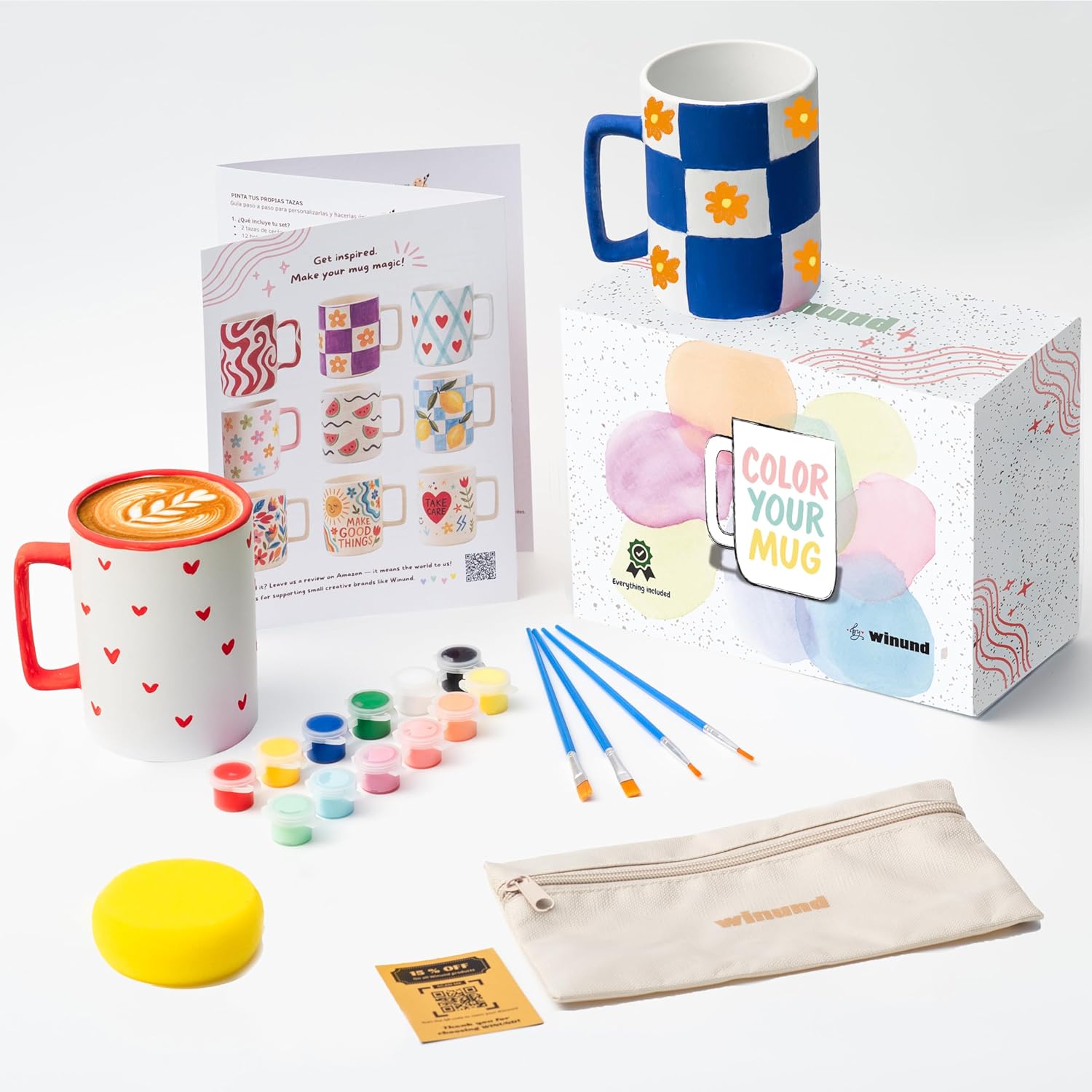 Incluye 2 tazas de cerámica blanca mate, 12 pinturas esmaltadas aptas para hornear (tonos pastel y clásicos), 4 pinceles, una esponja y unas instrucciones paso a paso.